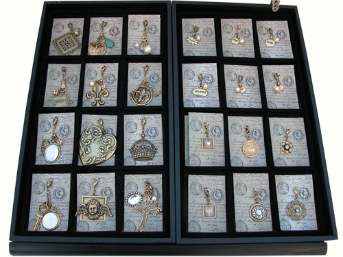 Our display card for our new line utilizes the image of an antique French passport. Look carefully and you will see the Classic Legacy stamp. The card is sized to fit into each compartment of the trays. The look compliments many of the interiors of retail stores. It showcases the vintage inspired Classic Legacy charms.