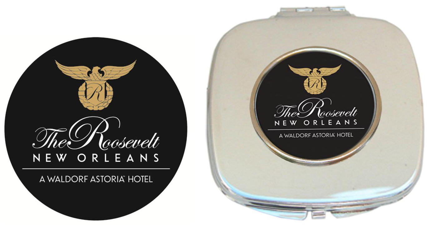 Custom Classic Legacy Purse Mirror with The Roosevelt Hotel Logo - You approve the screen sample…..or give us suggestions to improve on the design. When all design work is perfect we begin production. Our minimum order for custom design is only 24 pieces! If you order at least 60 pieces there is no set up fee. This photo frame is another favorite gift for corporations, hotels and resorts that we serve.